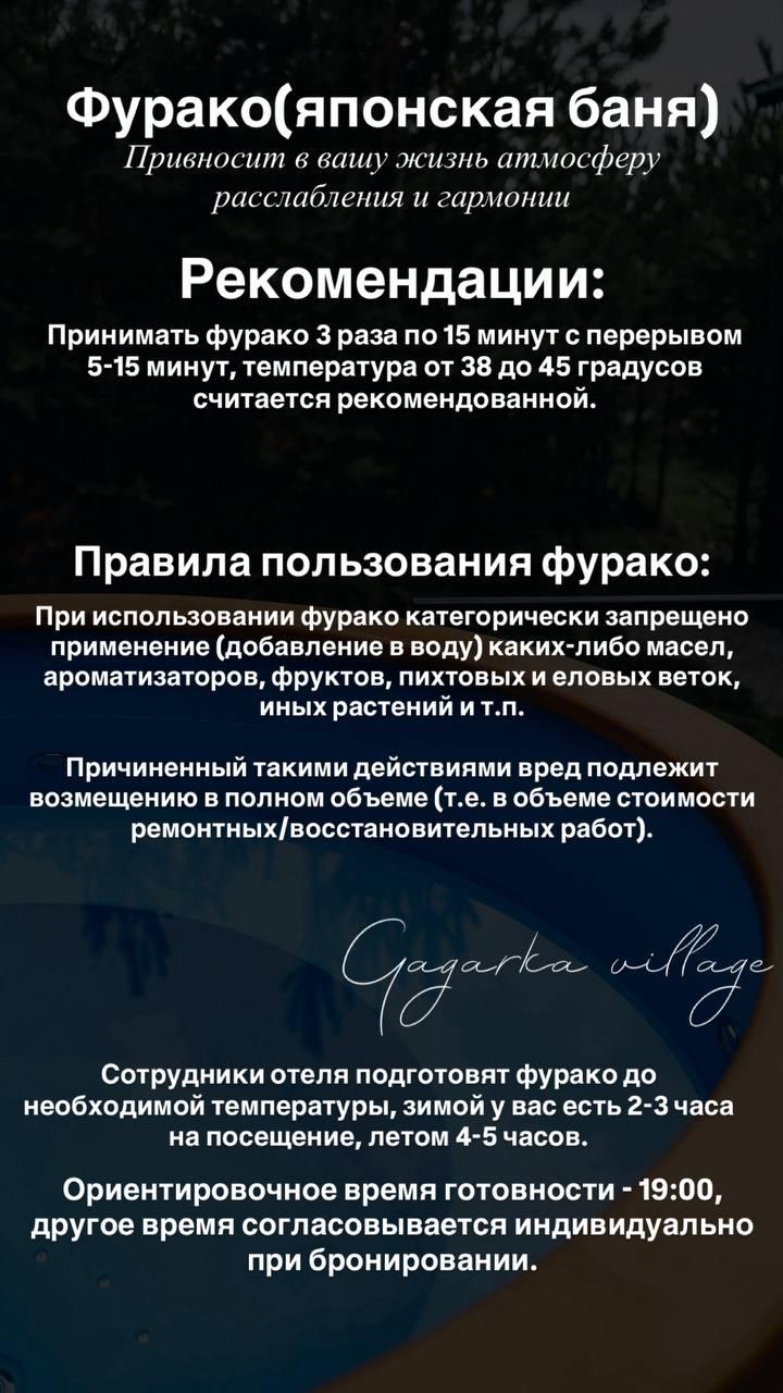 Фурако – горячая купель для расслабления под открытым небом Ощутите истинное удовольствие от релаксации в японской купели фурако. Горячая вода, аромат дерева, свежий воздух и звёздное небо – всё это создаёт незабываемую атмосферу отдыха и восстанавливает силы. Фурако – это традиционная японская баня, которая идеально подходит для расслабления мышц, улучшения кровообращения и полного восстановления после насыщенного дня. Почему стоит выбрать отдых в фурако? 1 Расслабление и антистресс: Горячая вода помогает снять усталость и напряжение, а вид природы вокруг усиливает эффект расслабления. 2 Оздоровление организма: Тёплая вода стимулирует кровообращение, укрепляет иммунитет, улучшает сон и общее самочувствие. 3 Идеальная атмосфера: Купель расположена под открытым небом. Вы можете наслаждаться звездным небом вечером или мягкими солнечными лучами днём, оставаясь в окружении природы. 4 Романтическая обстановка: Фурако – это отличное решение для романтического вечера. Атмосфера уединения и спокойствия подарит незабываемые моменты вдвоём. Как это работает? Мы подготовим купель специально для вашего отдыха: • Купель наполняется чистой артезианской водой и нагревается до комфортной температуры. • Для обогрева используется экологически чистое древесное топливо, которое создаёт мягкий природный аромат. • Вы можете наслаждаться фурако в любое время года, даже в холодное время – горячая вода согреет вас и подарит настоящее наслаждение. Условия использования фурако: • Стоимость: 6000₽/топка. • Купель готова к использованию в течение нескольких часов после растопки. Кому подойдёт фурако? • Семьям, которые хотят провести время вместе в расслабляющей атмосфере. • Парам для романтического отдыха. • Компании друзей для необычного досуга. • Всем, кто ищет гармонию с природой и момент полного расслабления. Забронируйте фурако уже сегодня! Добавьте незабываемый элемент к своему отдыху. Горячая купель фурако – это ваш путь к гармонии, уюту и настоящему удовольствию!